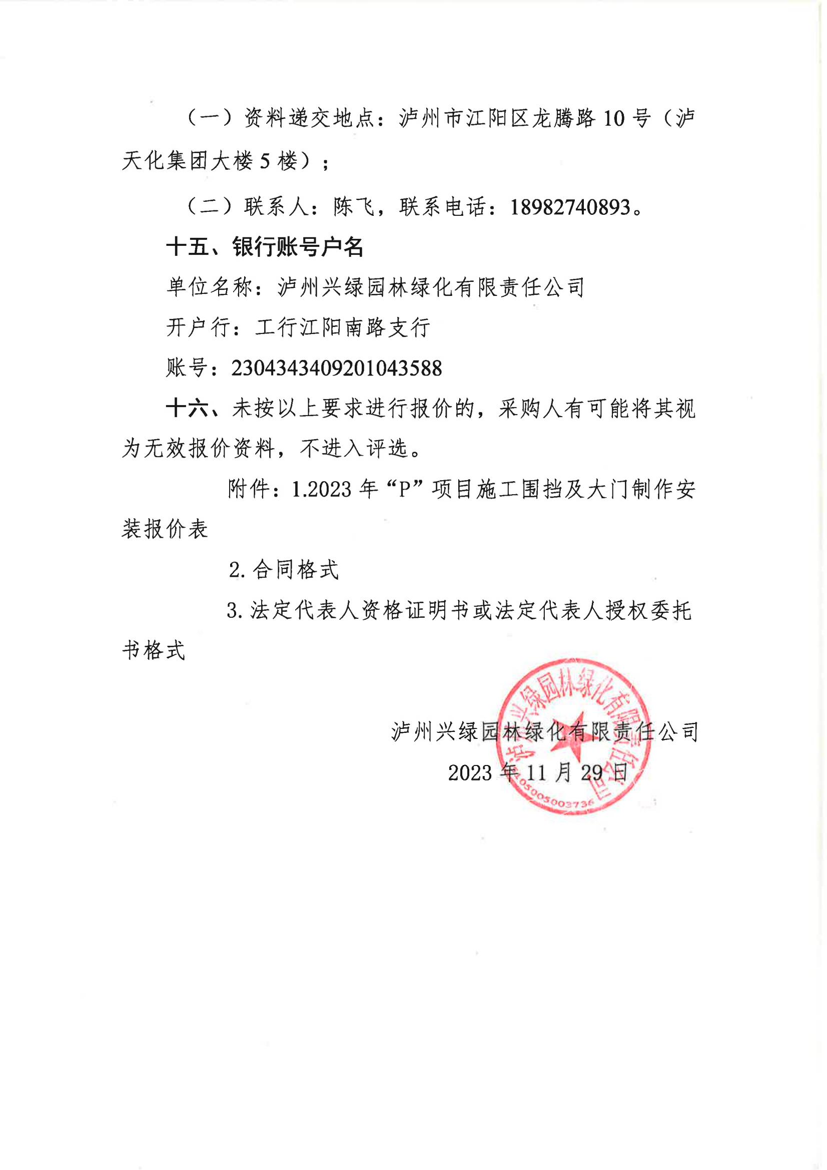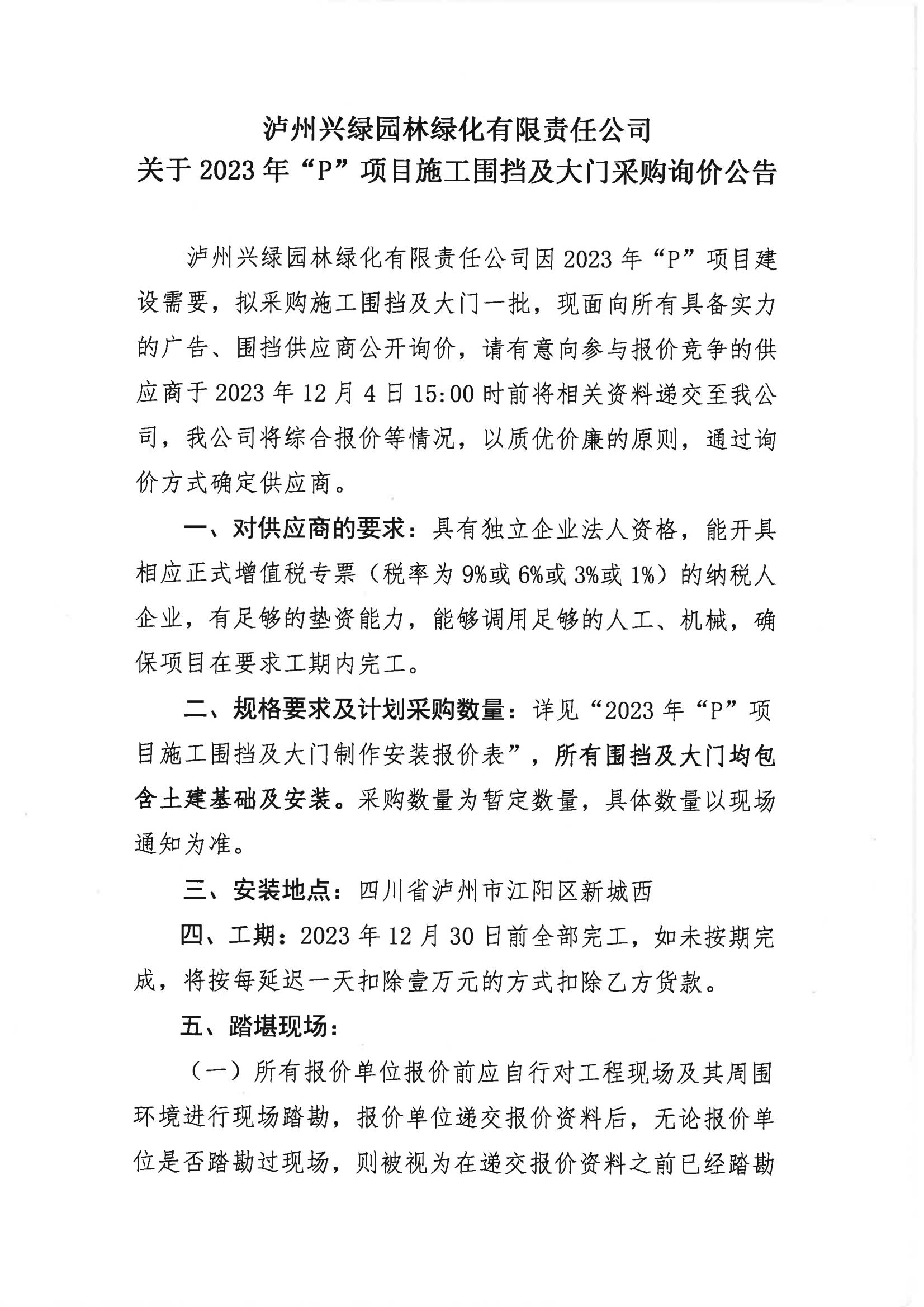 2023年“P”項目施工圍擋及大門采購詢價公告