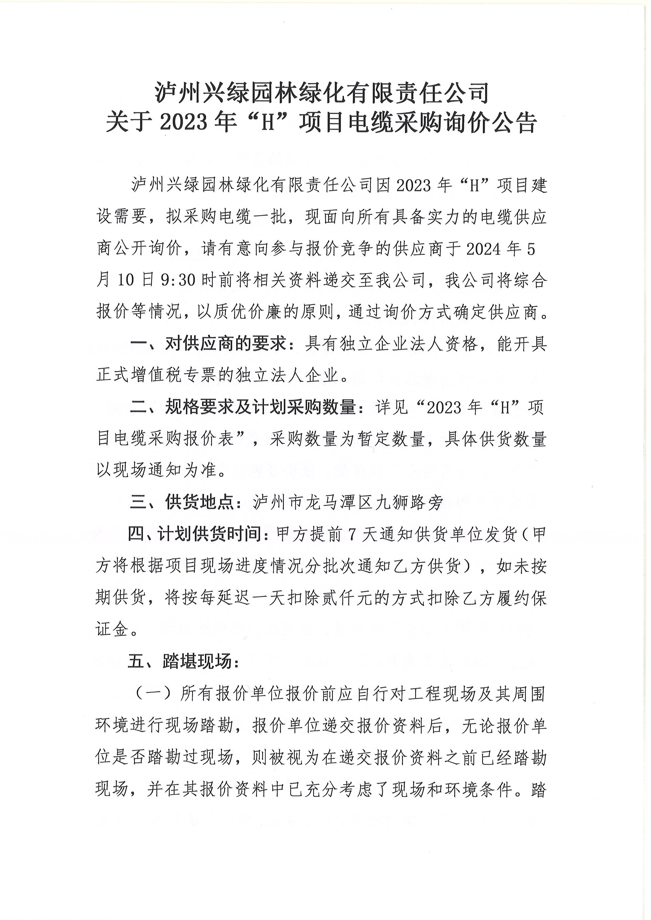 瀘州興綠園林綠化有限責(zé)任公司 關(guān)于2023年“H”項(xiàng)目電纜采購詢價(jià)公告